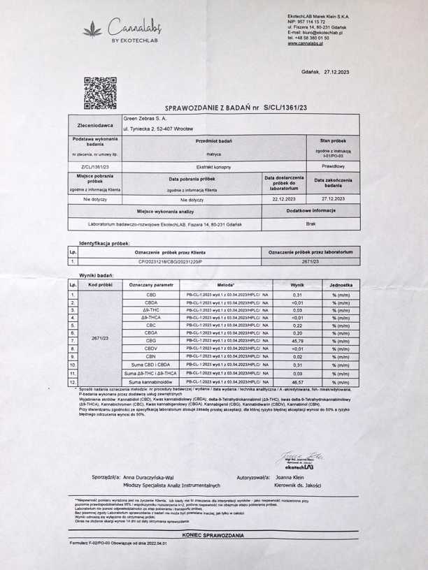 Sprawozdanie z badań nr S/CL/1361/23 z dnia 27.12.2023 potwierdza że pasta CBG uzyskana metodą ekstrakcji alkoholowej z odmian Santhica 70 i Enectarol uprawianych na Plantacji MARYA w Kryształowicach zawiera 45,79% kannabigerolu (CBG) i 46,57% sumy kannabinoidów. Zawartość THC wynosi 0,03% co spełnia polskie i unijne normy prawne. Badanie wykonało laboratorium CannLabs by EkotechLAB w Gdańsku na zlecenie Green Zebras S.A. z Wrocławia. Plantacja MARYA prowadzi stały nadzór laboratoryjny nad wszystkimi etapami produkcji i systematycznie publikuje wyniki badań dla klientów i partnerów.